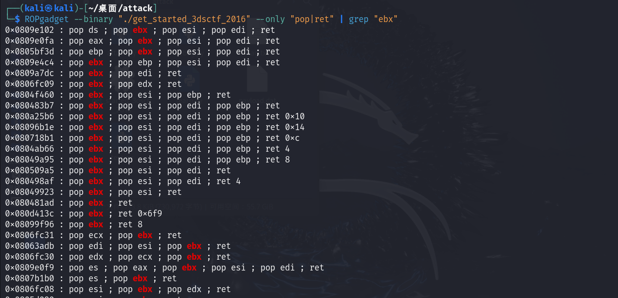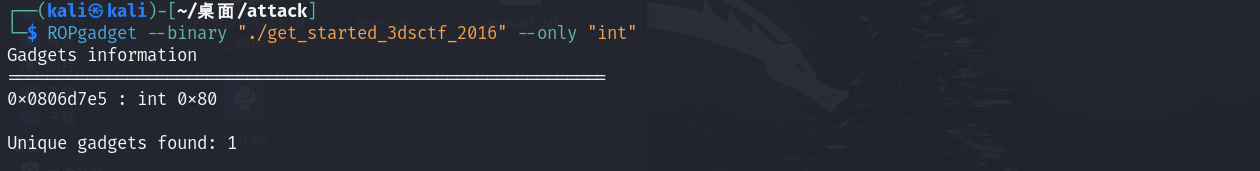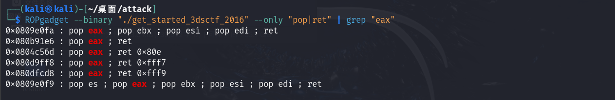 这条指令会把eax的值赋给edx指向的值,如果我们的edx存储的是bss段的buf的地址,eax存储的是/bin/sh(要分两次,因为eax只能存储4字节,后面看攻击脚本就知道了),那么就可以实现将buf的值赋值为/bin/sh了。