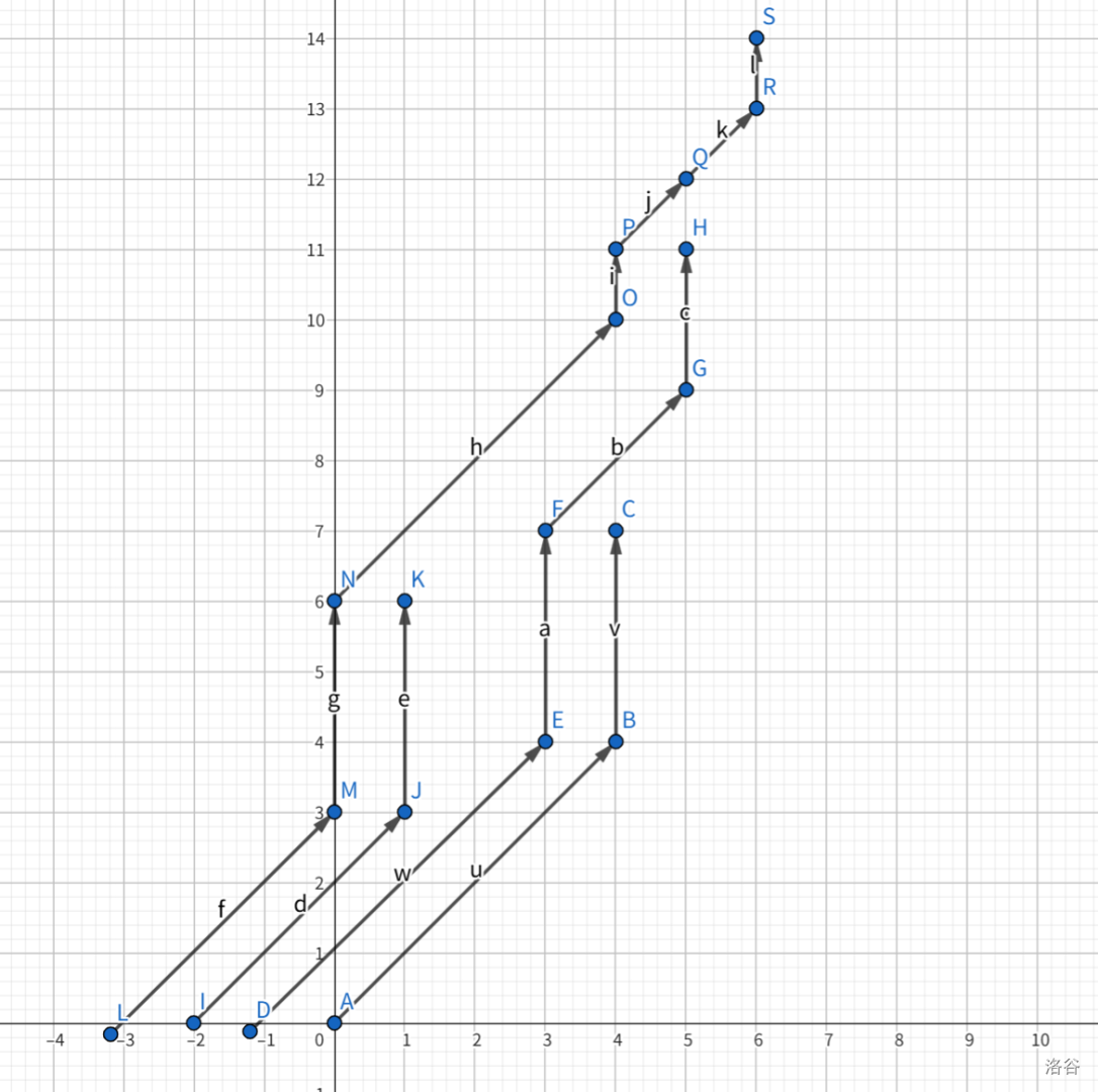 那么奶牛 \(i\) 到达终点 \(x_i\) 的时间 \(v_i\) 即为 \(\max\{x_i-s_j+t_j\}\),即 \(x_i-\max\{t_j-s_j\}\)。于是只需要维护一段前缀的 \(t_j-s_j\) 的最大值。到达终点后,会增加一条 \((x_i,v_i+1)\) 的竖直折线。