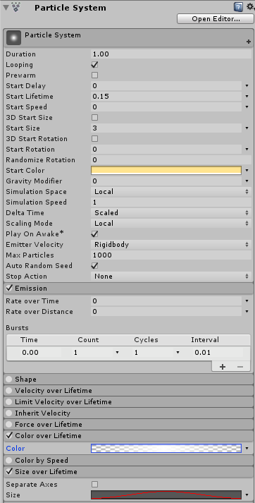 首先关闭粒子系统的Shape,在Particle System栏中将StartLifetime设置为一个很短的时间(我这里设置为0.15)。更改Start Color为一个合适的颜色。