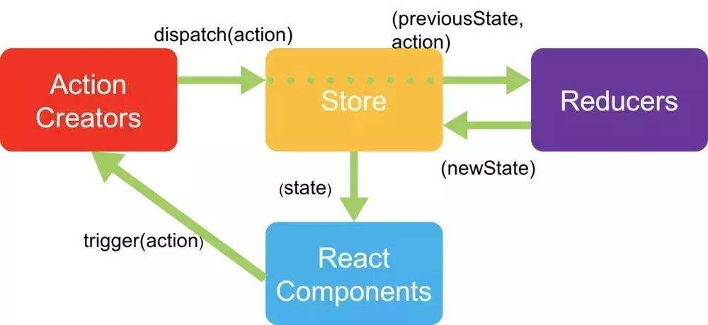 用户通过界面组件触发ActionCreator,携带Store中的旧State与Action 流向Reducer,Reducer返回新的state,并更新界面。