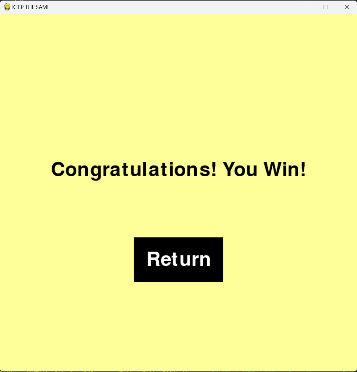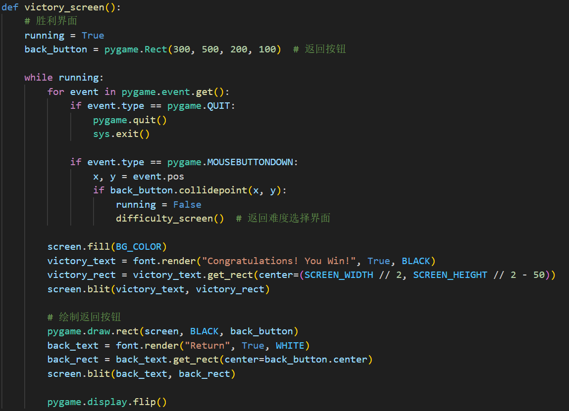 - 全部消除后,得到胜利画面,点击 return 可以重返难度选择界面,不想继续可以点击右上角的 “x”