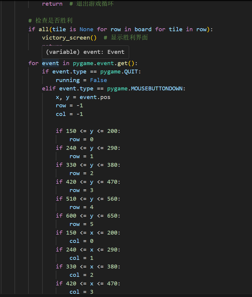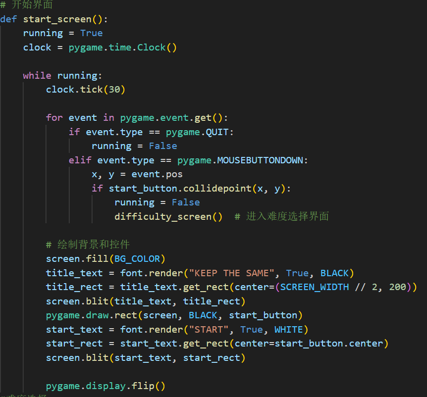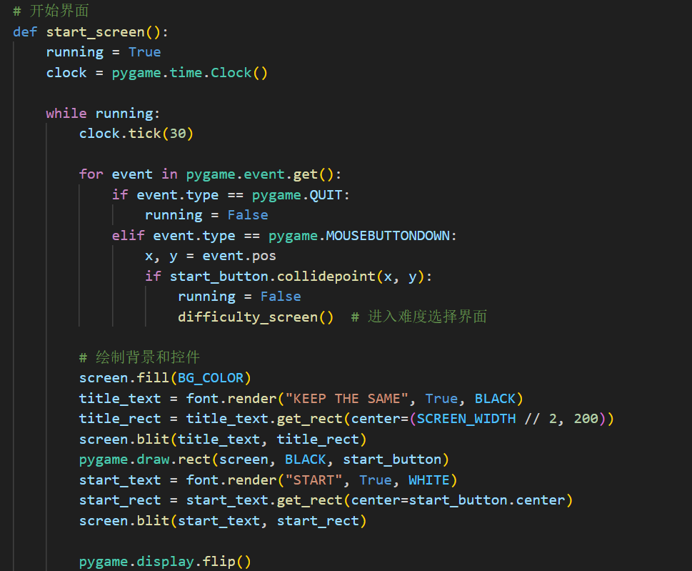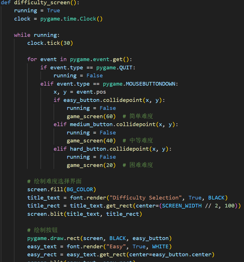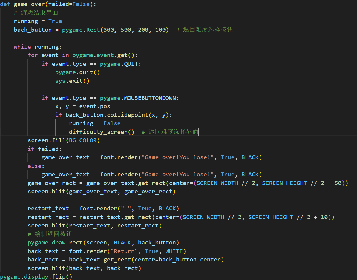 这份作业需要pygame的参与,这又是一个崭新的领域,由于时间的紧迫,于是我学习了pygame的大致内容,在安装pygame时还经历种种波折导致花了三个小时才安装完成,最终在aigc的帮助下磕磕绊绊完成了这份作业。