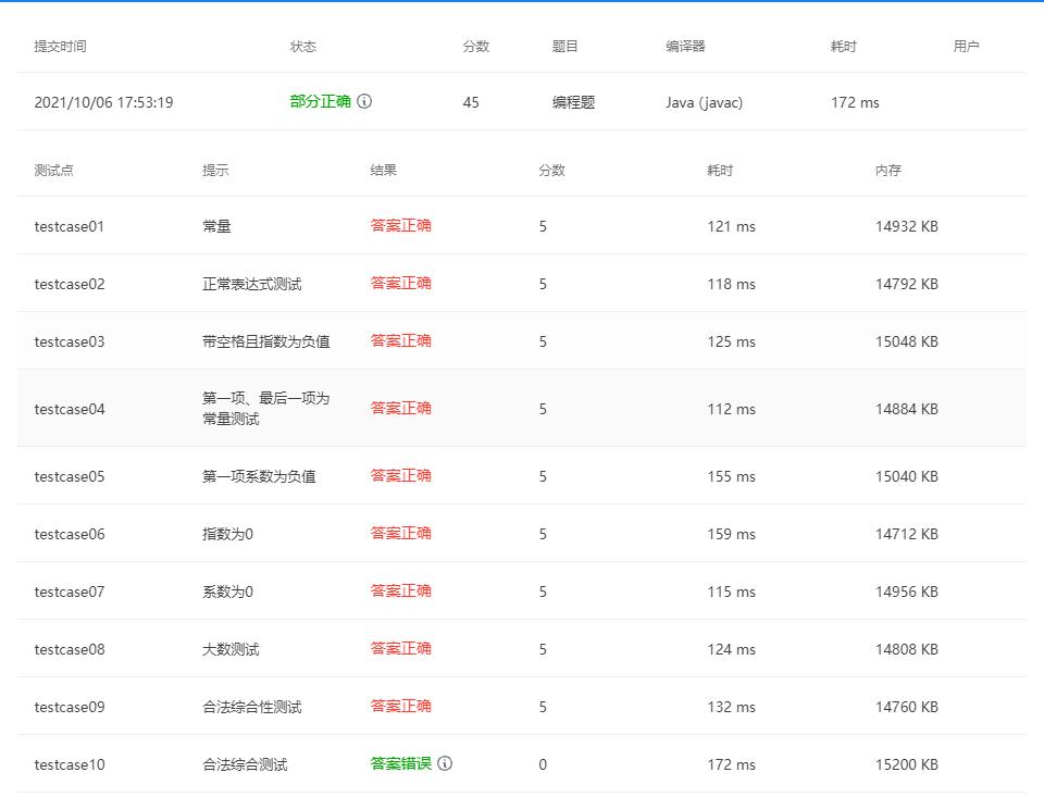 接着我写了多个方法来进行判断,判断输入的多项式,满足以上哪一种正则表达式,如果满足,就按照相对应的拆分方法进行拆分,然后在输出求导后的多项式。这个题目对我来说还是十分困难的,我写了好久,也咨询了很多同学,到最后也还是有一个测试点一直没有过。