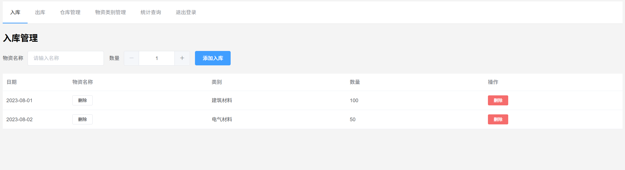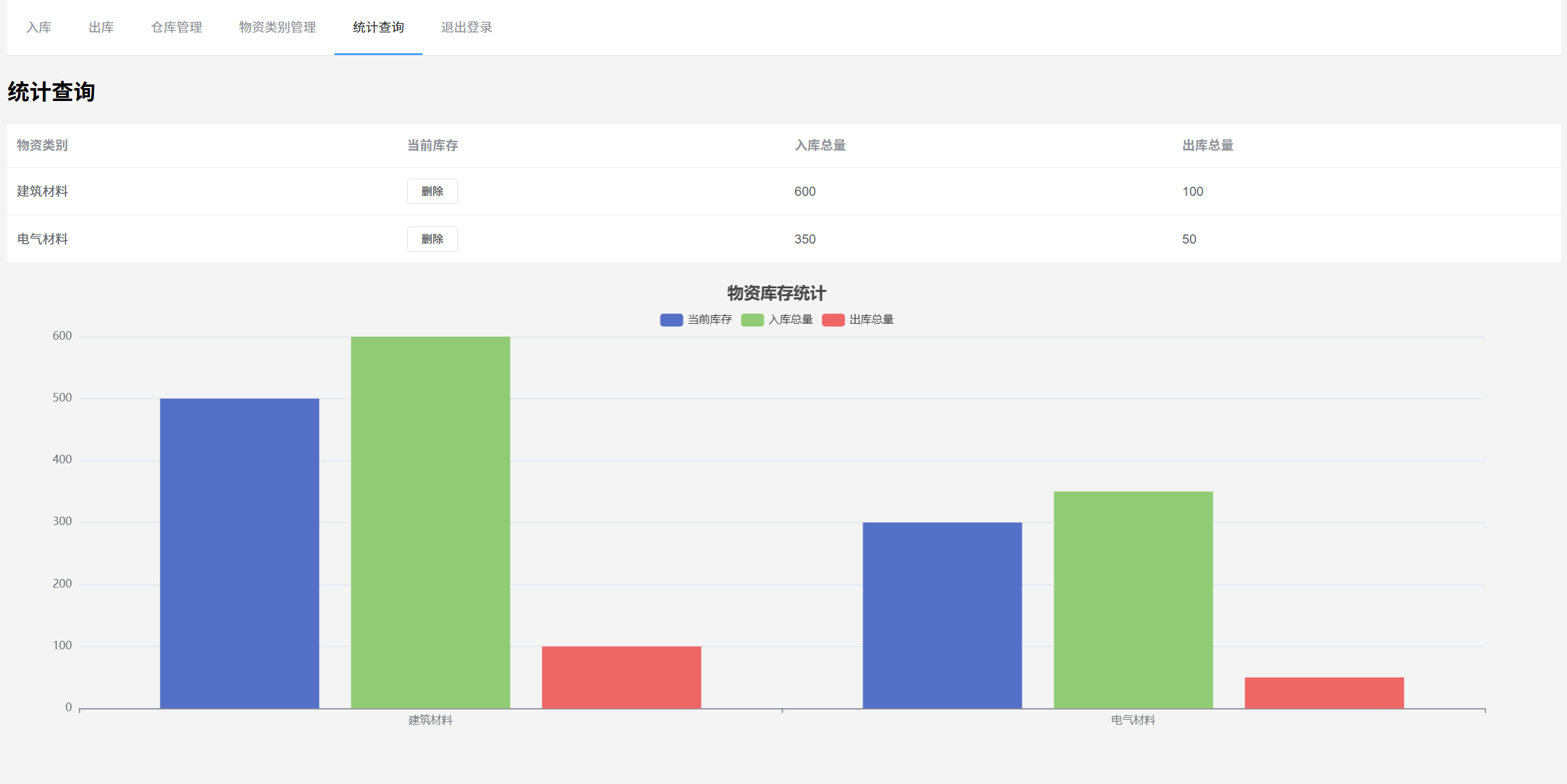 具体前端有导航栏,分别为出库入库,仓库管理,物资类别管理,统计查询,以及退出登录功能