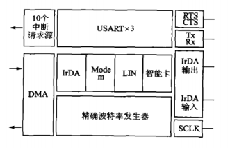 在STM32内部中,其配备了3个增强型USART接口,都支持最新的通信协议。每个USART的最大通信速率为4.5 Mbps。STM32的USART是一个可全面定制的串行通信口,其数据长度、停止位和波特率等都是可以设置的。在3个USART中,其中一个挂载于APB2总线上,另外两个则挂载在 APB1总线上。下图所示的是STM32的USART。