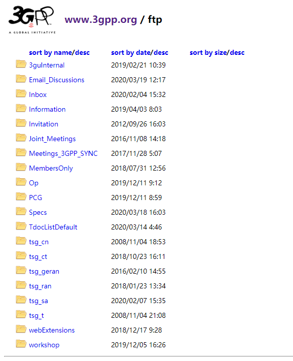 3GPP FTP的主目录如下图,FTP的目录结构基本与3GPP的组织架构吻合。其中tsg_cn对应之前的TSG_CN技术规范组相关的文档,tsg_t对应TSG_T技术规范组相关的文档,因为这两个技术规范组在后来被合并为TSG_CT技术规范组,所以tsg_cn和tsg_t这两个文件夹在2008年之后就不再更新了。tsg_ct,tsg_geran,tsg_ran,tsg_sa四个文件夹则分别对应TSG_CT技术规范组,TSG_GERAN技术规范组,TSG_RAN技术规范组,TSG_SA技术规范组相关的文档。Specs文件夹存放的则是3GPP各个系列的协议文档。