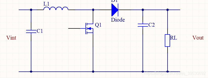 - 当MOS管导通时,电源Vint会给电感L充电,这时的电感将会储能,等待MOS管截止电感会放电。这时的电容放电,电感上的电流增加。二级管防止电容对地放电。
