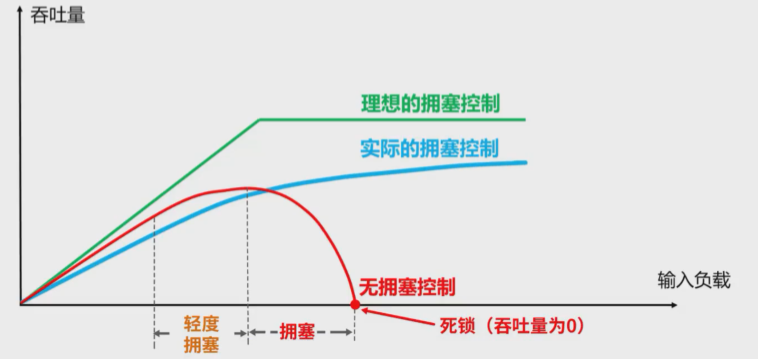 若出现拥塞而不控制,整个网络的吞吐量将随输入负荷的增大而下降