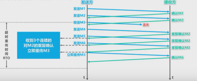 重复确认。 - 发送方一旦受到了三个连续的重复确认,就将相应的报文段