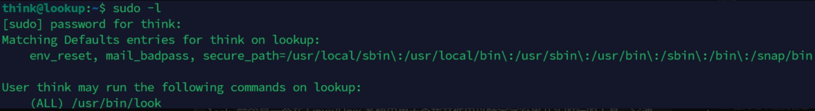 echo 'echo "uid=1000(think) gid=1000(think) groups=(think)"' >> /tmp/fakebin/id # 追加一行 echo 命令,打印出一段伪造的think用户信息。