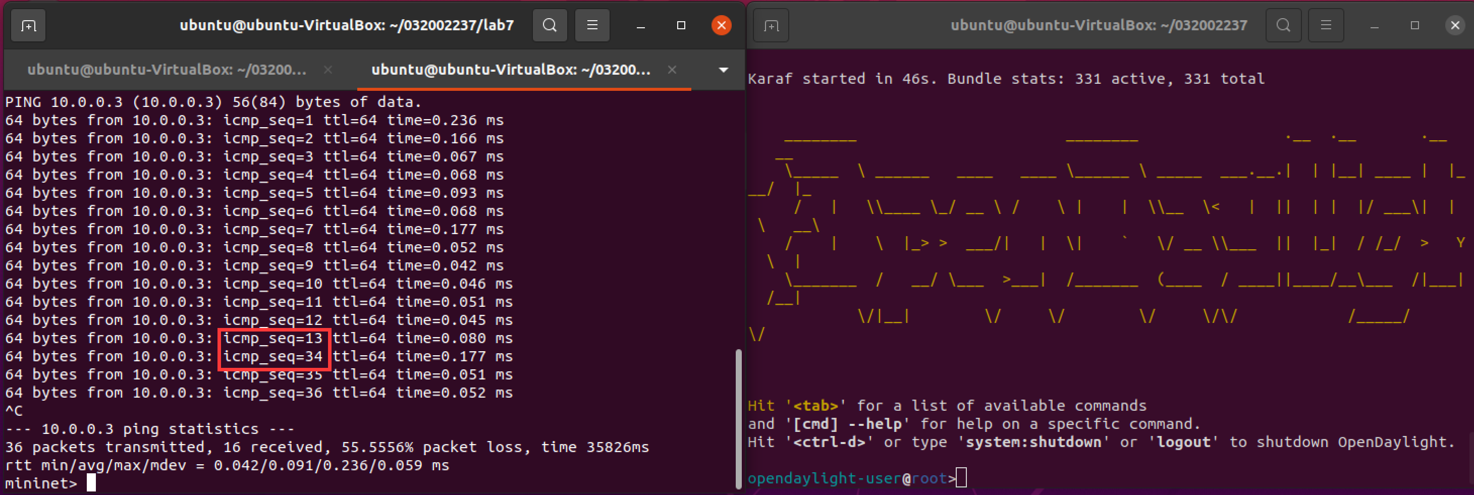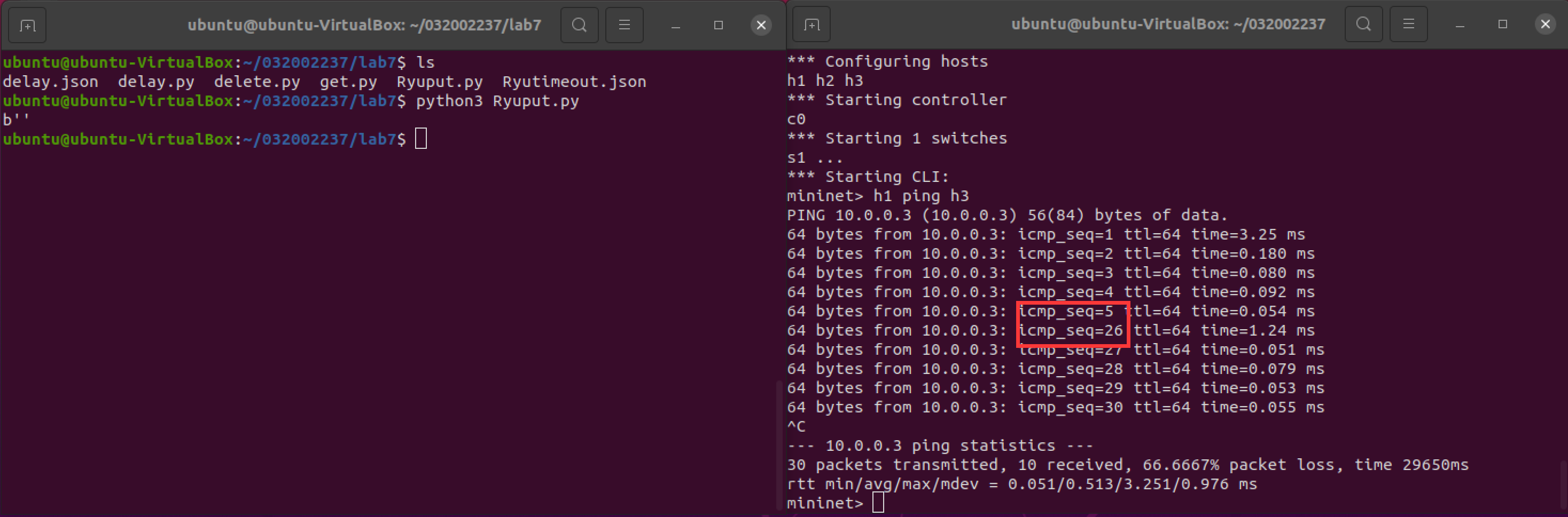(3) 编写Python程序,调用OpenDaylight的北向接口下发硬超时流表,实现拓扑内主机h1和h3网络中断20s。