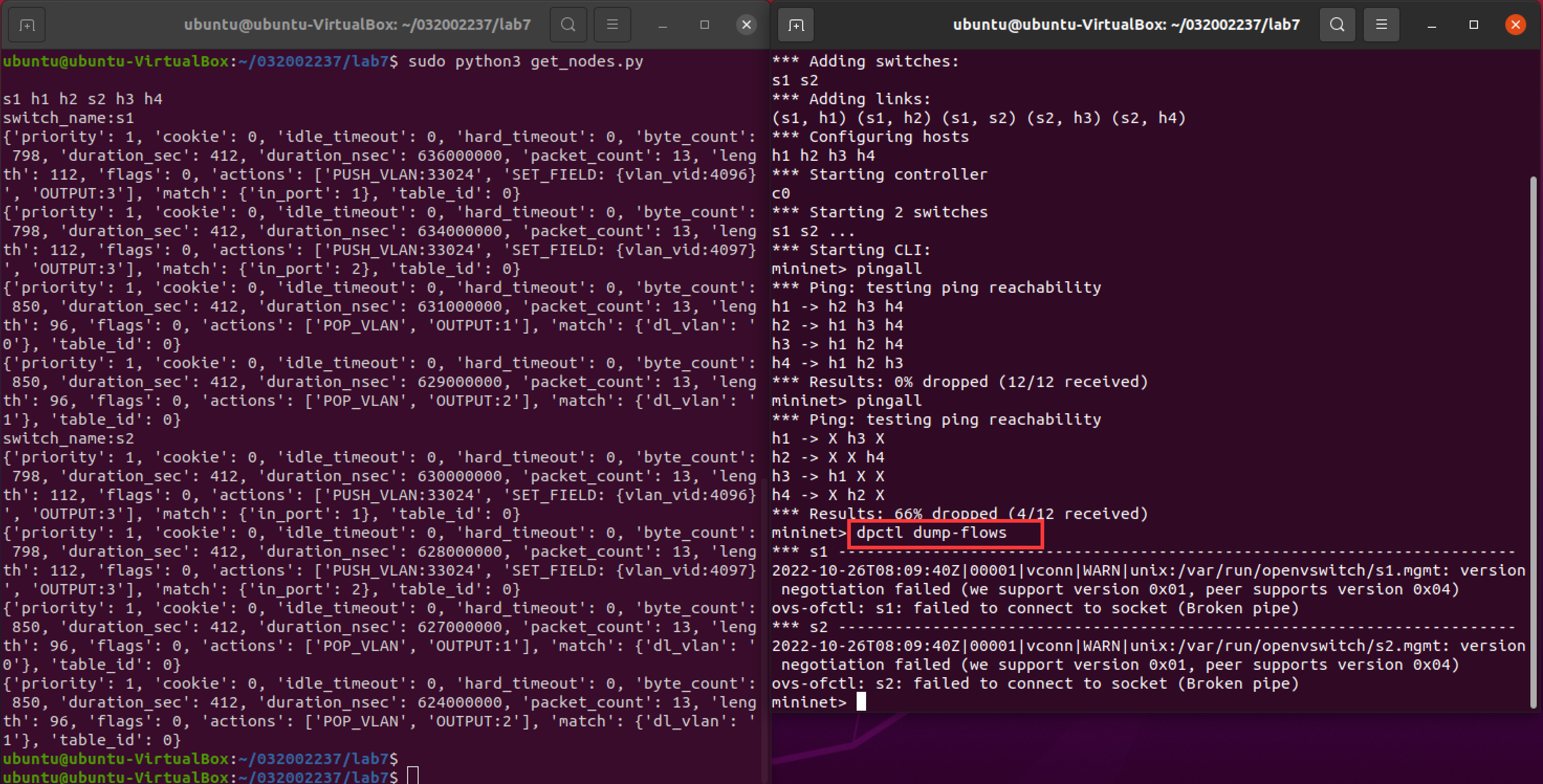 编程实现查看前序VLAN实验拓扑中所有节点(含交换机、主机)的名称,以及显示每台交换机的所有流表项