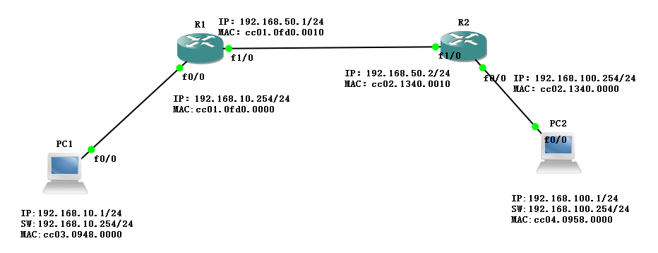 当R1收到数据报文后,会解封到网络层,查看目的是否可到,如果可以到,转发到对应接口,重新进行二层封装,源MAC变成了R1 f1/0接口MAC,目的MAC变成了R2 f1/0接口MAC。