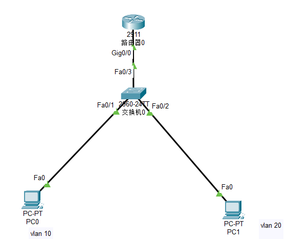PC0需要发送数据给PC1,发现PC1和自己不是同一个网段,这时将数据交给自己的网关,网关为路由器0的F0/0.1子接口(虚拟接口),通过ARP协议获取自己网关的MAC地址,数据会通过交换机进行转发,到了交换机之后,会为收到的数据打上vlan标签10,将数据传到路由器0,路由器0收到数据,集合路由器的工作原理,查看目的IP地址,找到对应接口,再进行标签转换,再发送到交换机,这时交换机收到的就是打上vlan 20的标签数据,根据交换的mac地址表的对应关系直接转发