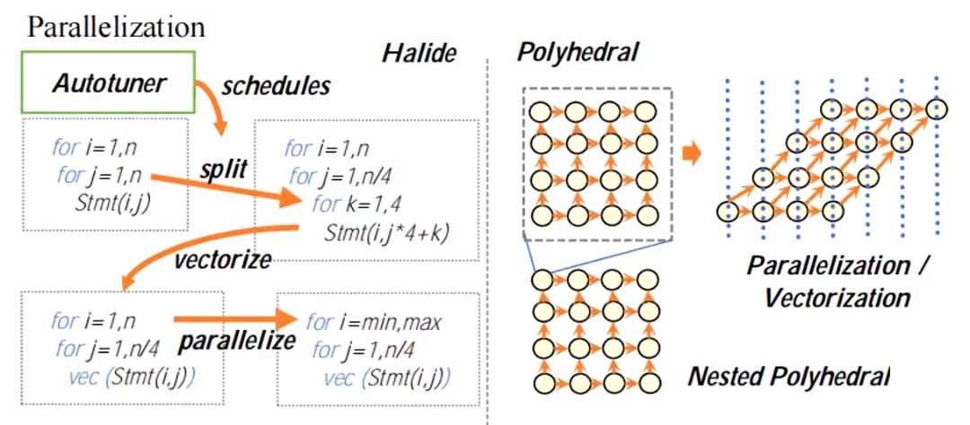 Halide语言将算法描述与算法中数据存储与计算执行等调度方面的内容解耦合。从而算法的描述和性能的优化可以分开进行,可以在不改动算法的情况下对算法进行调优。