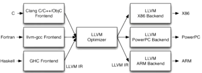 不同的前端后端使用同意的中间代码LLVM IR。