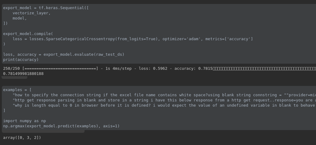 训练完模型之后,我们可以对样本进行预测,比如 examples 里面有 3 个样本,分别截取自 stack overflow 数据集,关于预测效果,大家可以自行测试
