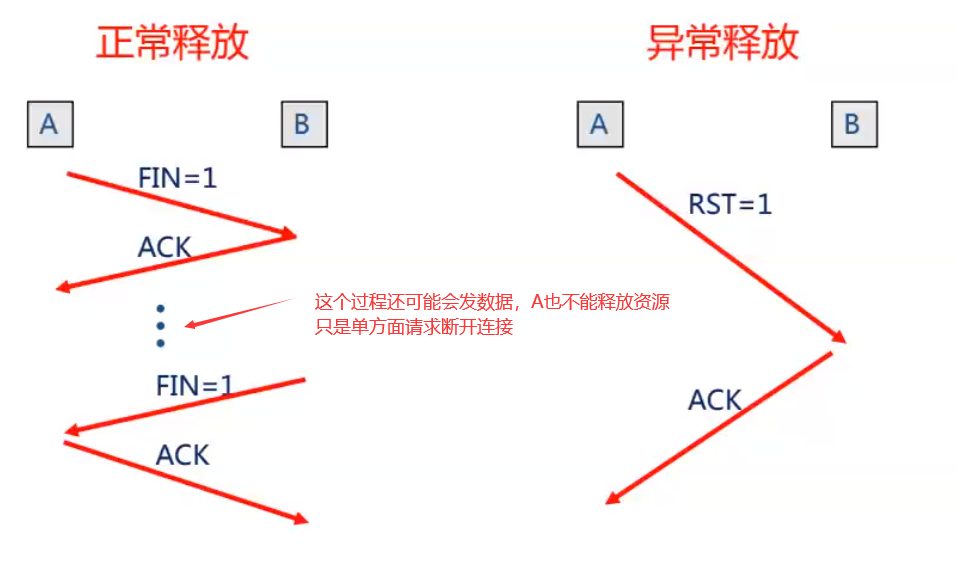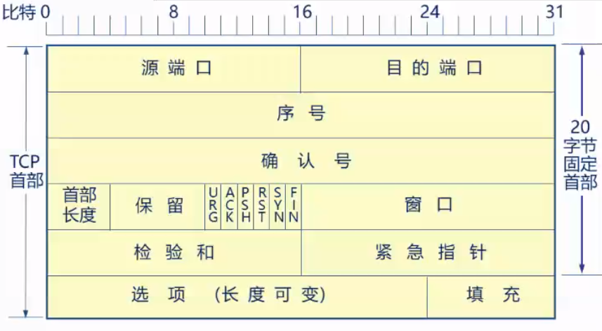 URG——紧急比特标记,当URG置为1时,表明紧急指针字段有效。通知本报文段中有紧急数据,应尽快传送,紧急数据的优先级要高。ACK——只有当ACK置为1时,确认号字段才有效。正常情况下只有第一次握手时ACK=0PSH(Push)——推送比特,接收方收到推送比特置为1的报文段,就尽快地将该报文段的数据交付给接收应用进程,而不再等到整个缓存都填满了后再向上交付RST(ReSet)——复位比特,当RST=1时,表明TCP连接中出现严重差错,必须强行释放连接,属于单方面强行断开连接SYN——同步比特,SYN置为1,表示这是一个连接请求报文。正常情况下只有第一次握手和第二次握手时SYN等于1,其余都等于0FIN(Final)——终止比特,用来正常释放一个连接。当FIN=1时,表明此报文段的发送端的数据已发送完毕,并请求对方释放连接,当对方确认后,会释放发送缓存窗口字段——占2字节。窗口字段是流量控制的关键,用来控制对方发送窗口的大小,单位为字节。接收方根据自身的缓存大小确定自己的接收窗口大小,然后通知对方以确定对方的发送窗口的上限- 检验和——占2字节。检验和字段检验的范围包括首部和数据这两部分,在计算检验和时,要在TCP报文段的前面加上12字节的伪首部