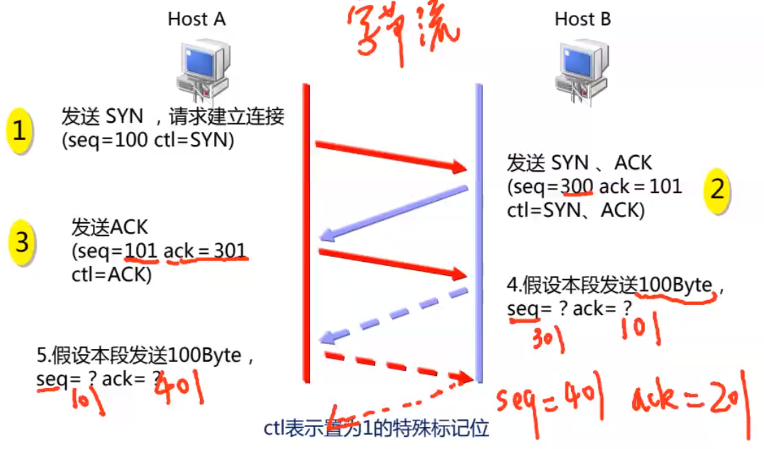 源端口和目的端口字段——各占2字节。端口是传输层与应用层的服务接口,类似一个地址标识。传输层的复用和分用功能都要通过端口才能实现序号字段——占4字节。TCP连接中传送的数据流中的每一个字节都编上一个号。序号字段的值指的是本报文段所发送的数据的第一个字节的编号确认号字段——占4字节,是期望收到对方的下一个报文段的数据的第一个字节的序号。注意,当有数据要发送给对方时,顺便确认,当没有数据发送给对方时,单独发一个确认报文- 特殊标记(Flag):每个标记占一个bit,有特殊约定