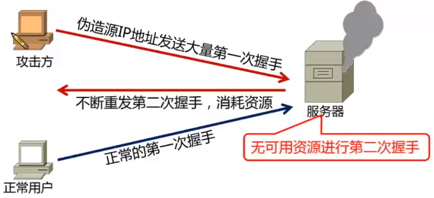 - 攻击原理:服务器进行第二次握手之后会在超时时间内(一般为75秒)跟踪该连接,未收到第三次握手会不断重发,消耗资源