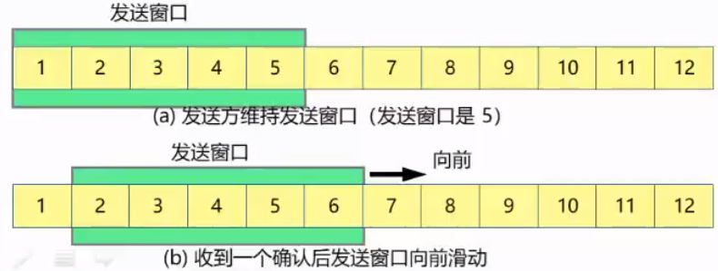 - 发送方:窗口不满则发送至窗口满,窗口满则等待,收到确认窗口向后移动,