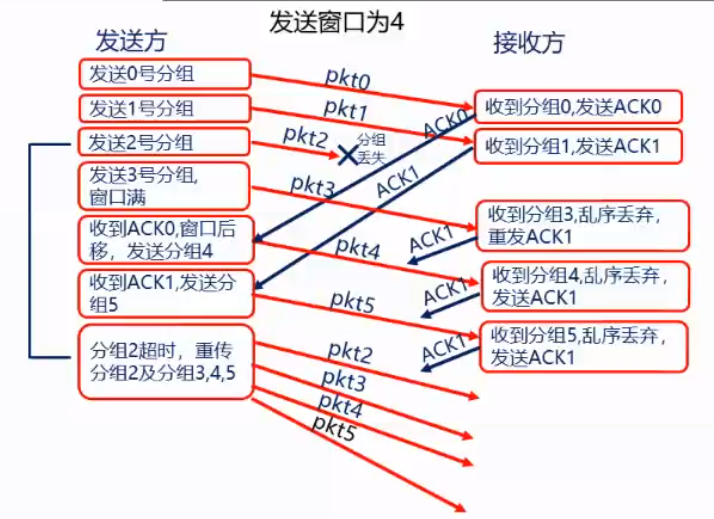 某个分组出错或丢失则重传该分组及其后面所有已发送但未被确认的分组