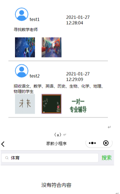 本系统是基于微信小程序的家教程序。系统分为2个部分组成,普通用户的操作界面与管理员的操作界面。前端主要使用微信WXML,普通用户的操作页面可以发布,查看动态,与他人聊天,更改个人信息。管理员操作界面则可以发布管理员信息,删除非法的动态,评论或者是账号。