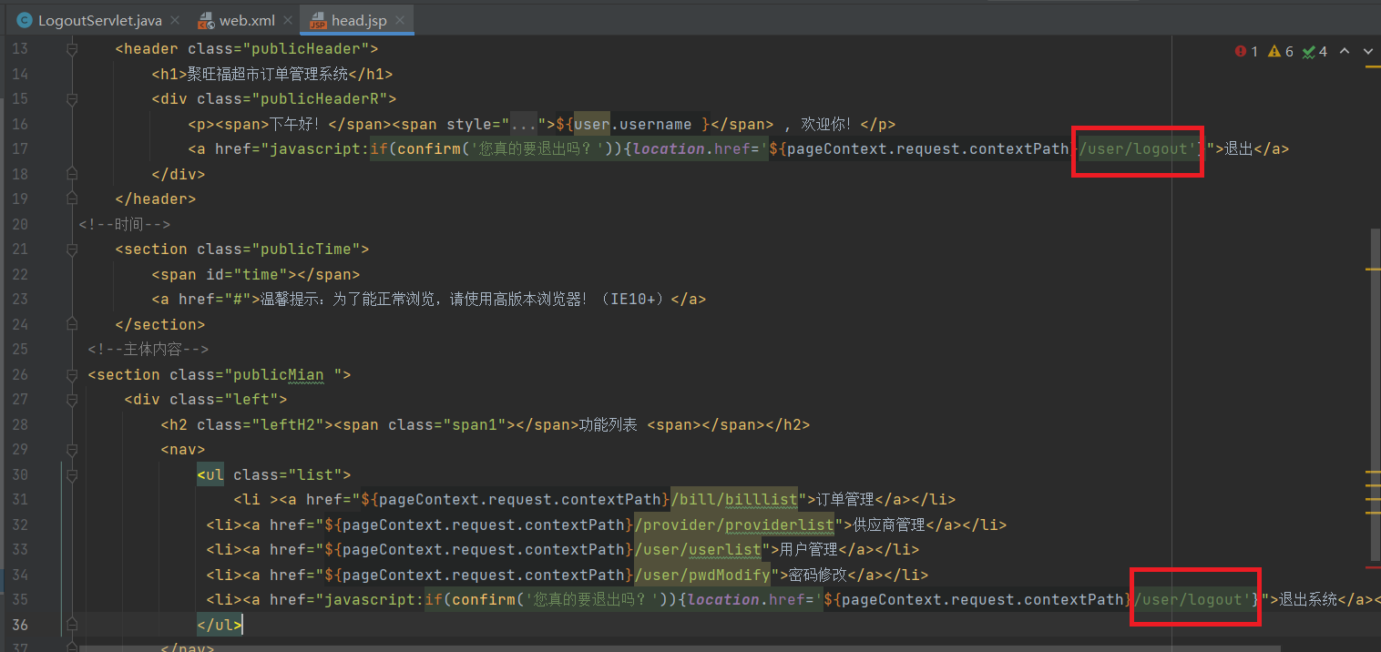 (2)在web.xml中注册我们的servlet,注意这里的url-patten是走的前端的jsp/common/head.jsp下的退出走的那个url