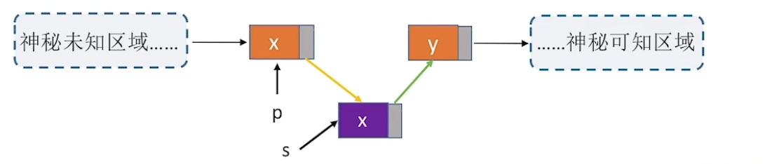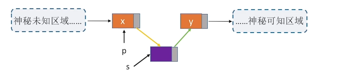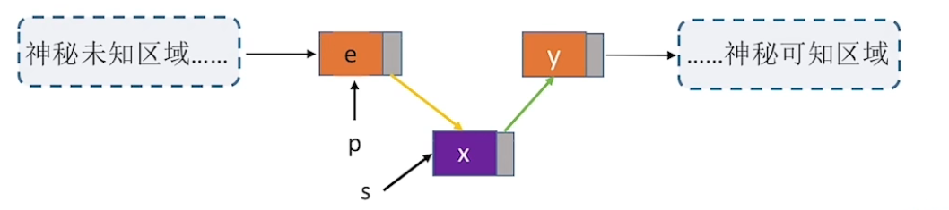 同样的问题发生了,删除指定节点\(p\),还需要修改其前驱节点的next指针,对于前面未知且神秘的区域来说,该如何找到前驱节点呢