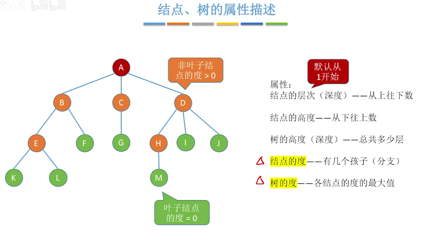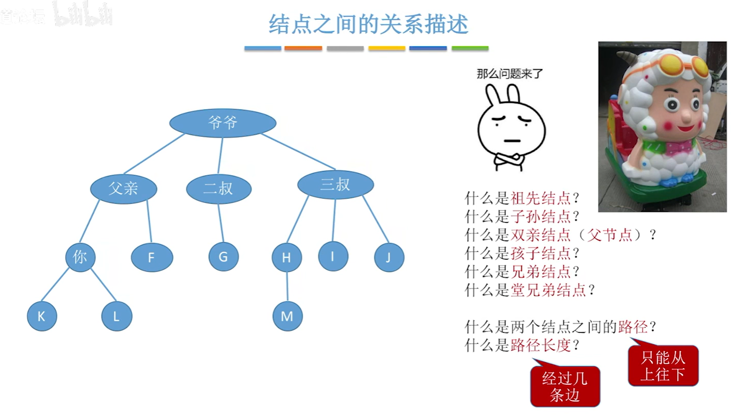 对于“你”来说,父亲、爷爷都是祖先节点;对于“爷爷”来说,下面全部节点都是子孙节点;对于“你”来说,直接前驱“父亲”就是双亲节点(父节点);对于“父亲”节点来说,直接后继“你”和“F”就是孩子节点;“二叔”、“三叔”是“父亲”的兄弟节点;“G”"H"“I”“J”就是“你”的堂兄弟节点(这个不怎么用)