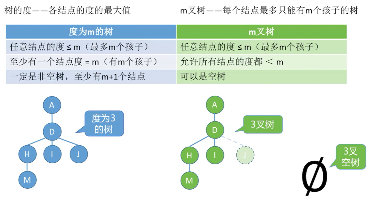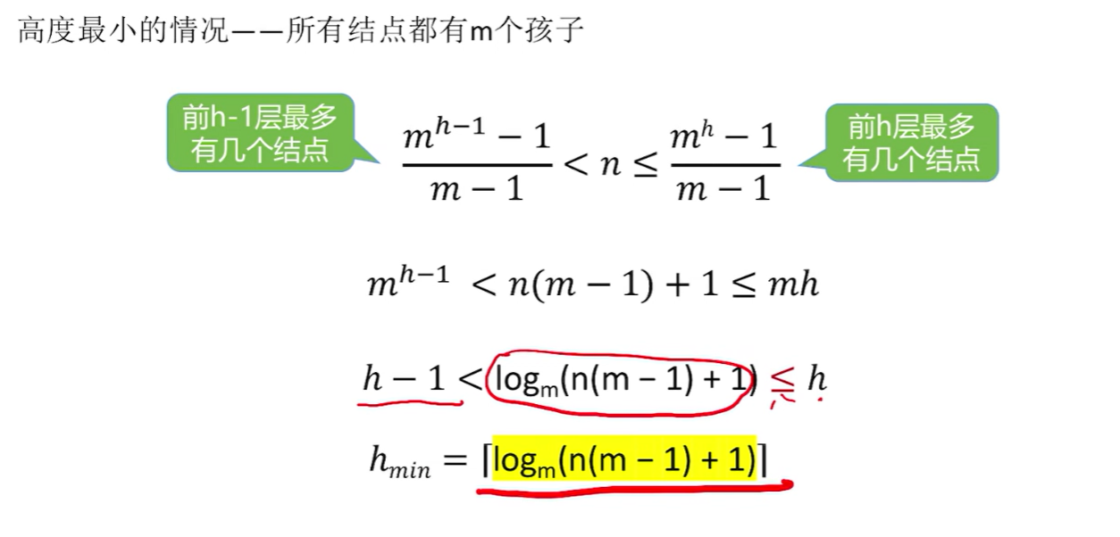 如果是高度为\(h\)的\(m\)叉树,那就是一条完全线性结构,至少有\(h\)个节点;如果是高度为\(h\)、度为\(m\)的树,那就要满足至少有一层含有\(m\)个节点,其他的同理