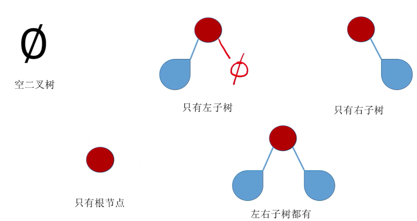 - 由一个根节点和两个互不相交的左子树和右子树组成,其中左子树右子树它们又分别都是一颗二叉树