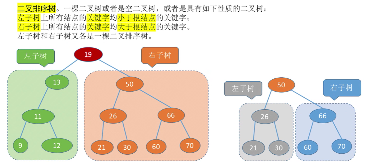 - 根节点右子树的关键字一定大于根节点的关键字(与堆?不同)