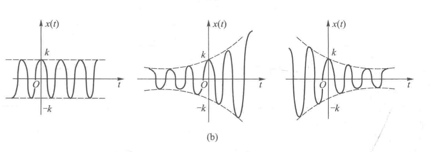 - 一般的\(x(t)=ke^{\sigma t}(\cos\omega t +j\sin\omega t)\),如果\(\sigma < 0\),信号呈增幅振荡;如果\(\sigma > 0\),信号呈衰减振荡。如下图所示