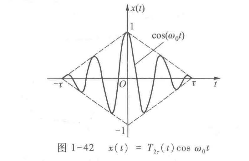 三角形脉冲同时具有窗口特性和幅度约束特性。例如,要想得到下图的信号\(x(t)\),只要将余弦信号与三角形脉冲\(T_{2\tau}(t)\)相乘即可