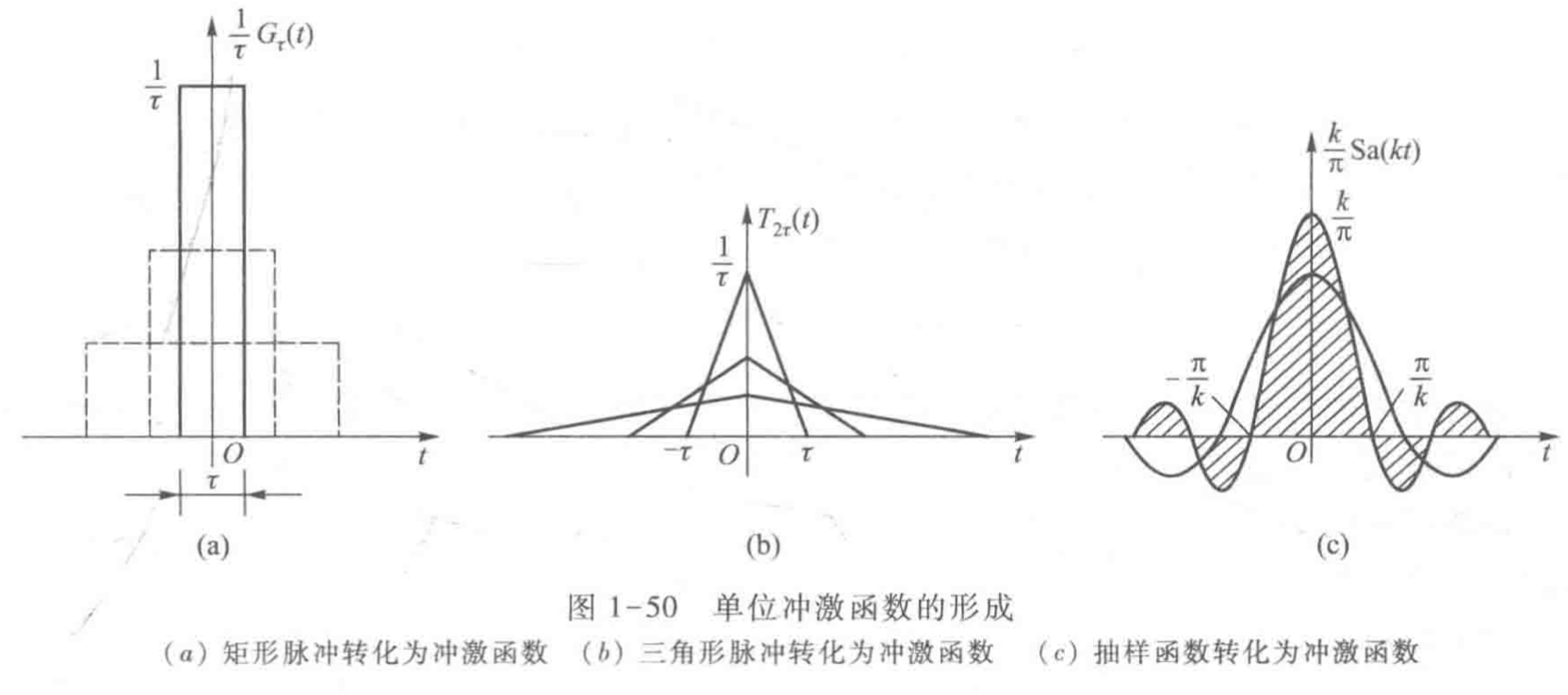 单位冲激信号可以通过普通信号取极限的方法来定义:图(a)为脉冲宽度为\(\tau\)、幅度为\(\frac{1}{\tau}\),即信号与时间轴所包围的面积为单位\(1\)的对称窄脉冲信号\(\frac{1}{\tau}G_{\tau}(t)\);图(b)为脉冲宽度为\(2\tau\)、幅度为\(\frac{1}{\tau}\),即信号与时间轴所围包围的面积为单位\(1\)的三角形脉冲函数。图(c)为抽样函数引入参变量\(k\),当参变量取\(k\to\infty\)时,同样可以定义冲激信号。