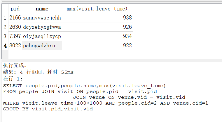 WHERE visit.leave_time + 100 > 1000 AND people.cid = 2 AND venue.cid = 1