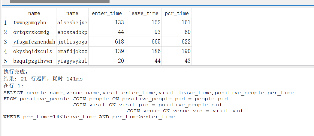 SELECT people.name,venue.name,visit.enter_time,visit.leave_time,positive_people.pcr_time