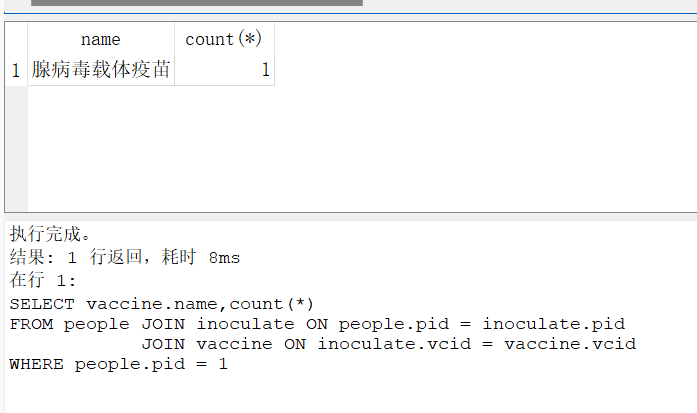 JOIN vaccine ON inoculate.vcid = vaccine.vcid