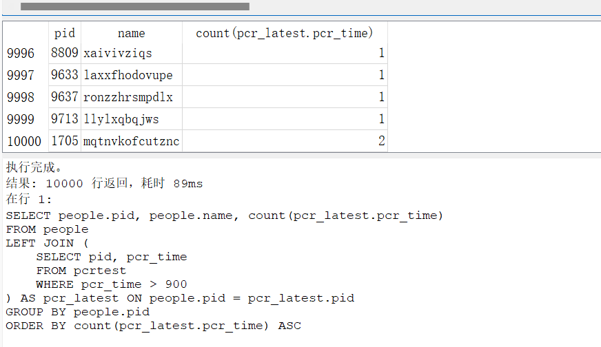 SELECT people.pid, people.name, count(pcr_latest.pcr_time)