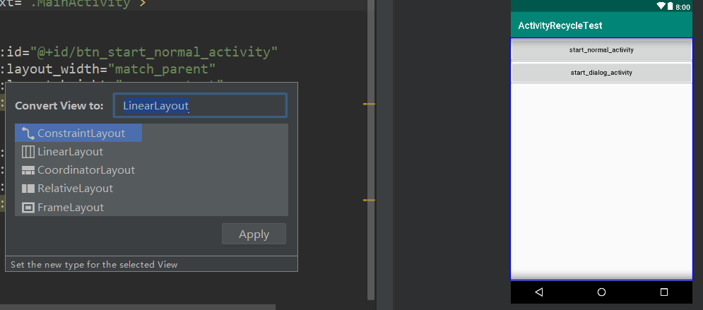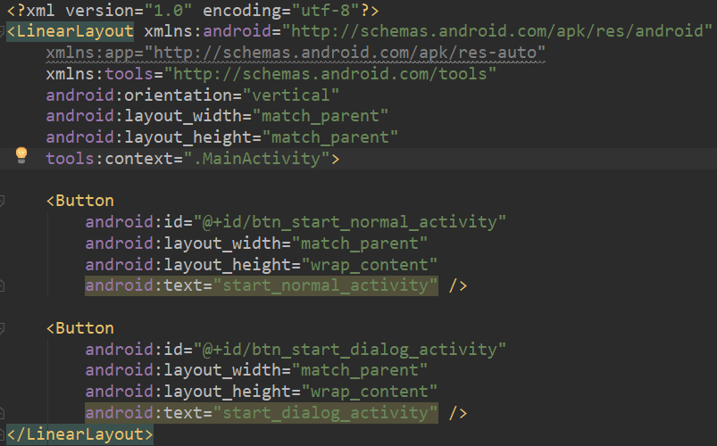 MainActivity 布局文件设置两个按钮,一个用来打开NormalActivity,一个用来打开DialogActivity。设置布局为线性布局(右键-->Convert View) orientation朝向改为垂直。