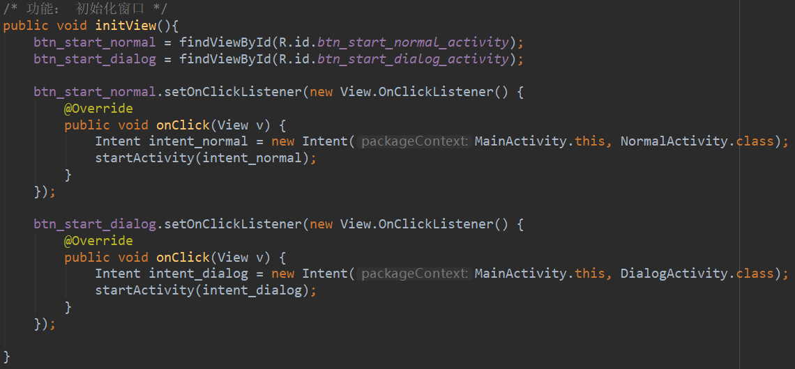 给两个按钮添加监听器,监听其点击事件。将initView方法,放入onCreate方法中,onCreate方法当我们第一次创建Activity时,会被调用。