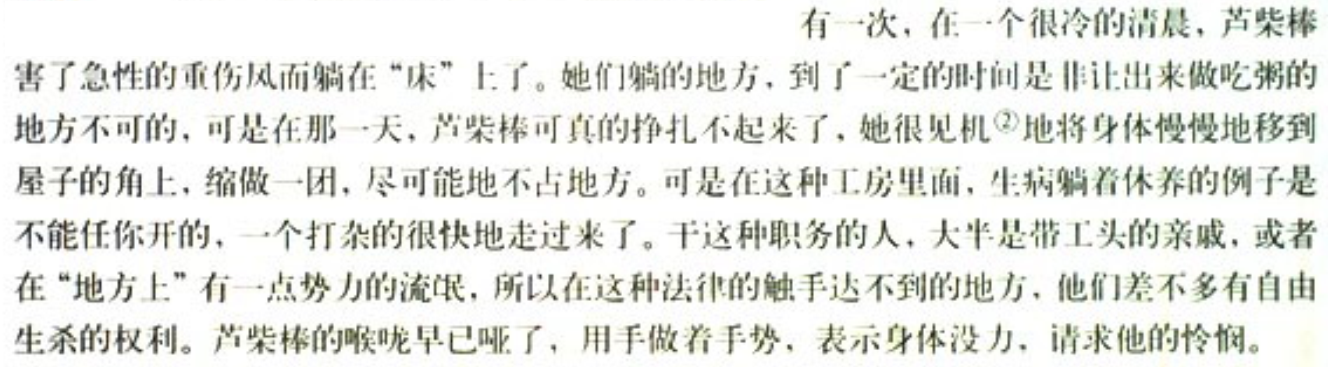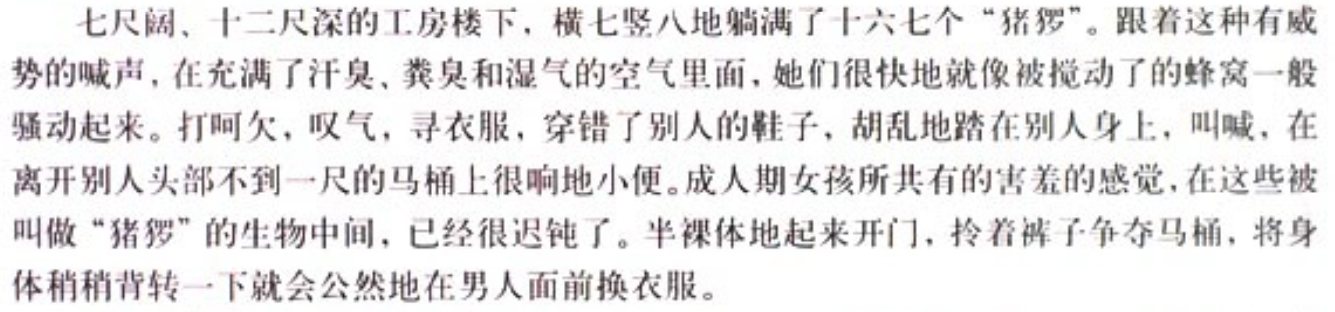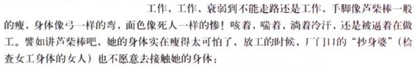 “面”上描述了一个包身工悲惨生活的框架,“点”上刻画则是填充其中的具体材料。