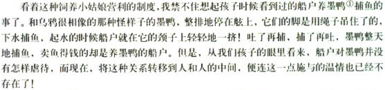 如课文的39段。这里作者发生了联想,联想是记叙文中一中常见的思维方式。作者从船户和墨鸦之间的关系联想到了现在人和人之间的关系。但是,从我们孩子的眼里看来,船户对墨鸭..... (这里转到了议论和抒情和前文的记叙进行了组合,强烈的表达了作者的情感。)