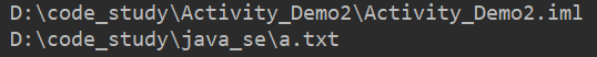 public static void show2(){ File f1 = new File("D:\\code_study\\Activity_Demo2\\Activity_Demo2.iml"); String path = f1.getPath(); System.out.println(path); File f2 = new File("a.txt"); String path2 = f2.getPath(); System.out.println(path2); }