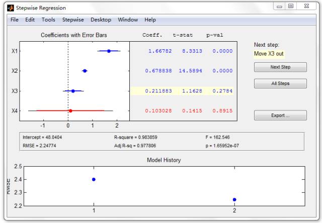 在图 4 中,用蓝色行显示变量 X1、X2、X3、X4 均保留在模型中,窗口的右侧按钮上方提示:将变量X3剔除回归方程(Move X3 out),单击 Next Step 按钮,即进行下一步运算,将第 3 列数据对应的变量 X3 剔除回归方程。单击 Next Step 按钮后,剔除的变量 X3 所对应的行用红色表示,同时又得到提示:将变量 X4 剔除回归方程(Move X4 out),单击 Next Step 按钮,这样一直重复操作,直到 “Next Step” 按钮变灰,表明逐步回归结束,此时得到的模型即为逐步回归最终的结果。