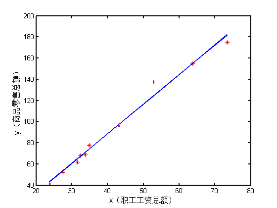 xlabel('x(职工工资总额)','fontsize', 12) %横坐标名