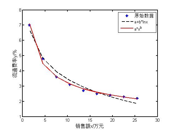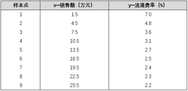 [ 例2 ] 为了解百货商店销售额 x 与流通率(这是反映商业活动的一个质量指标,指每元商品流转额所分摊的流通费用)y 之间的关系,收集了九个商店的有关数据(见表2)。请建立它们关系的数学模型。