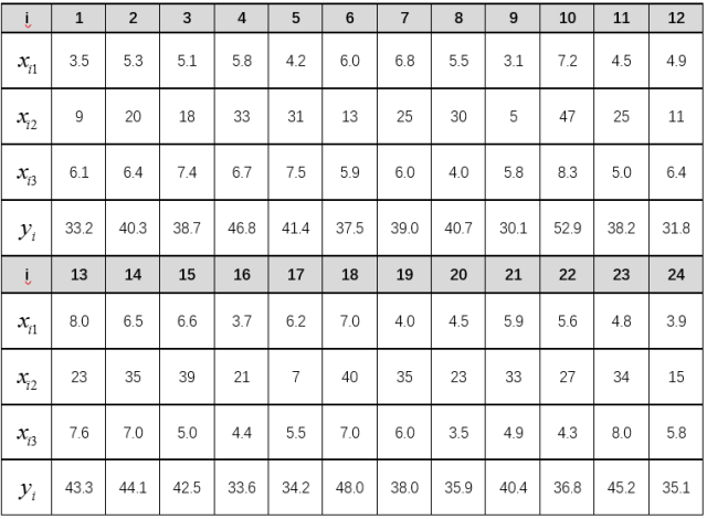 [ 例3 ] 某科学基金会希望估计从事某研究的学者的年薪 Y 与他们的研究成果(论文、著作等)的质量指标 X1、从事研究工作的时间 X2、能成功获得资助的指标 X3 之间的关系,为此按一定的实验设计方法调查了 24 位研究学者,得到如表3 所示的数据( i 为学者序号),试建立 Y 与 X1 , X2 , X3 之间关系的数学模型,并得出有关结论和作统计分析。